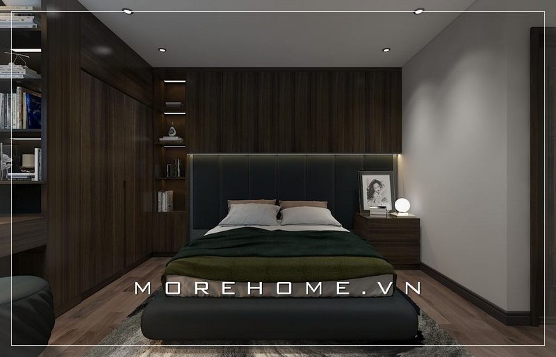 Thiết kế nội thất phòng ngủ chung cư nhỏ hiện đại, gam màu nâu trầm được sử dụng xuyên suốt cả không gian tạo sự sang trọng và ấm cúng hơn