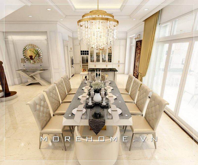 Thiết kế nội thất phòng ăn biệt thự hiện đại sử dụng tone màu trắng tinh tế tạo không gian tiện nghi và sang trọng