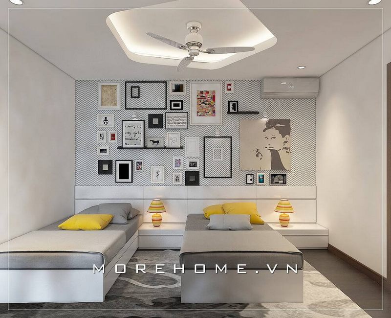 Không gian phòng ngủ trẻ em được bố trí khoa học và tiện nghi, cách trang trí hiện đại, sinh động giúp kích thích trí tưởng tượng, tư duy và sáng tạo