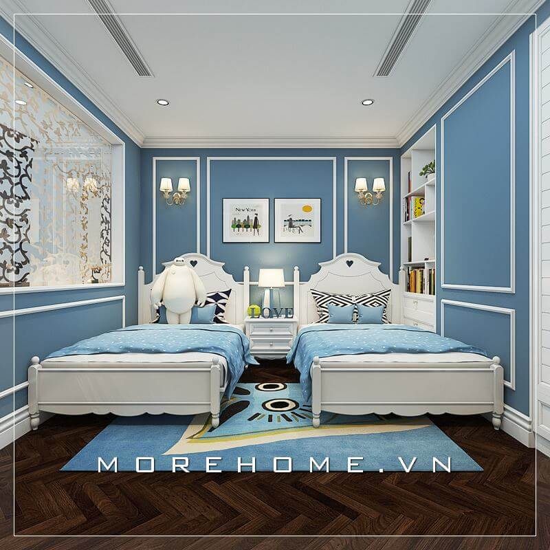 Để tạo nên sự mới lạ và năng động hơn cho phòng ngủ của bé trai, nội thất được lựa chọn là 2 tone màu trắng - xanh. Sàn gỗ nâu trầm cũng góp phần tạo nên cảm giác ấm áp cho không gian phòng ngủ.