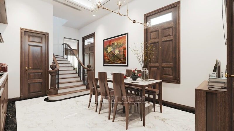 Biệt thự Đông Anh Hà Nội được thiết kế nội thất phòng ăn theo phong cách hiện đại với chất liệu gỗ óc chó.