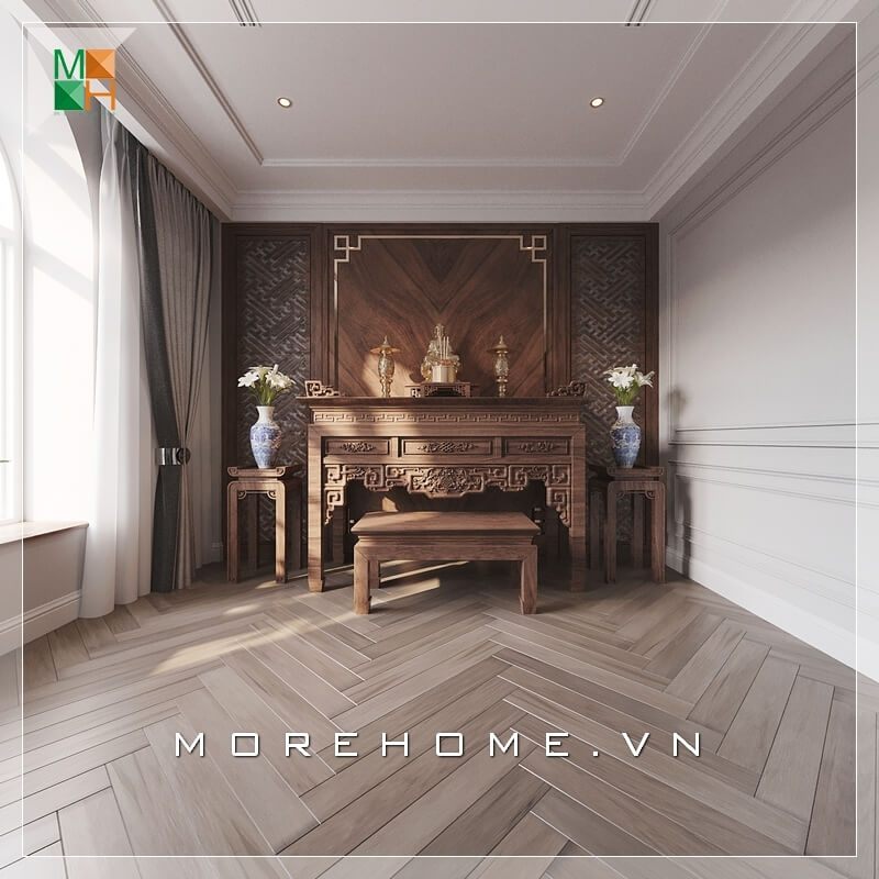 Mẫu bàn thờ gỗ óc chó cao cấp mang đến nét tinh tế của phong cách tân cổ điển nâu, tạo nên một ấn tượng trầm ấn trong biệt thự của bạn.