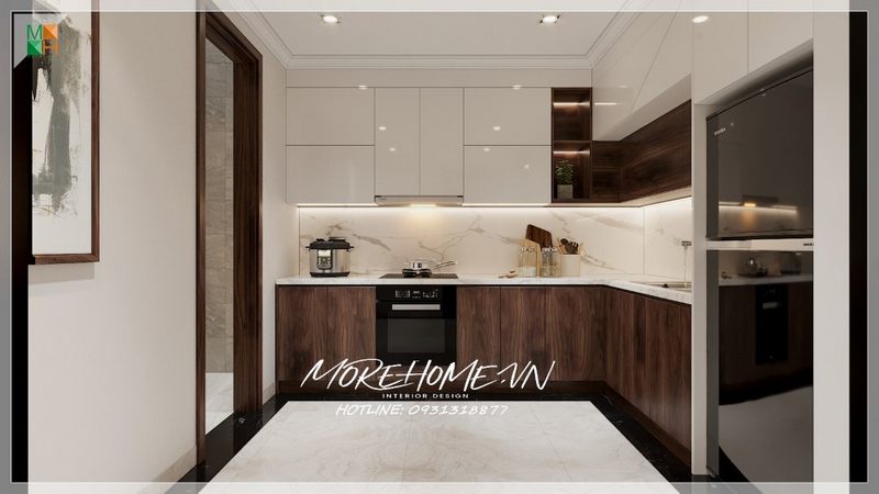 Mẫu tủ bếp chữ L với hệ tủ dưới làm bằng gỗ công nghiệp veneer gỗ óc chó, được kết hợp với mặt đá trắng vân mây, hệ tủ trên làm bằng gỗ acrylic tráng gương trắng hiện đại, có thể dễ dàng sử dụng.