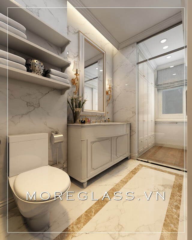Mẫu thiết kế phòng vệ sinh đẹp được trang bị nội thất cao cấp với màu trắng sang trọng, phù hợp với không gian biệt thự.